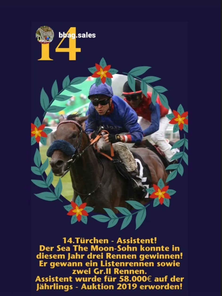 Im Adventskalender der BBAG, versteckte sich hinter dem Heute geöffneten Türchen mit der Nummer = 14 = kein Geringerer als der im Besitz von Eckhard Sauren und Liberty Racing 2020 stehende Assistent. Gerne erinnern wir uns an seinen Listen- und Gruppe – Doppelschlag zu Saisonbeginn innerhalb von nur vier Wochen in Düsseldorf und Köln. Nicht zu vergessen sein Erfolg im Hansa Preis und Rang Zwei im GP von Baden hinter Junko, dem späteren Sieger in der Hong Kong Vase. Wie freuen uns auf eine hlffentlich erneut erfolgreiches Jahr 2024 mit dem dann fünfjährigen Sea the Moon – Sohn.