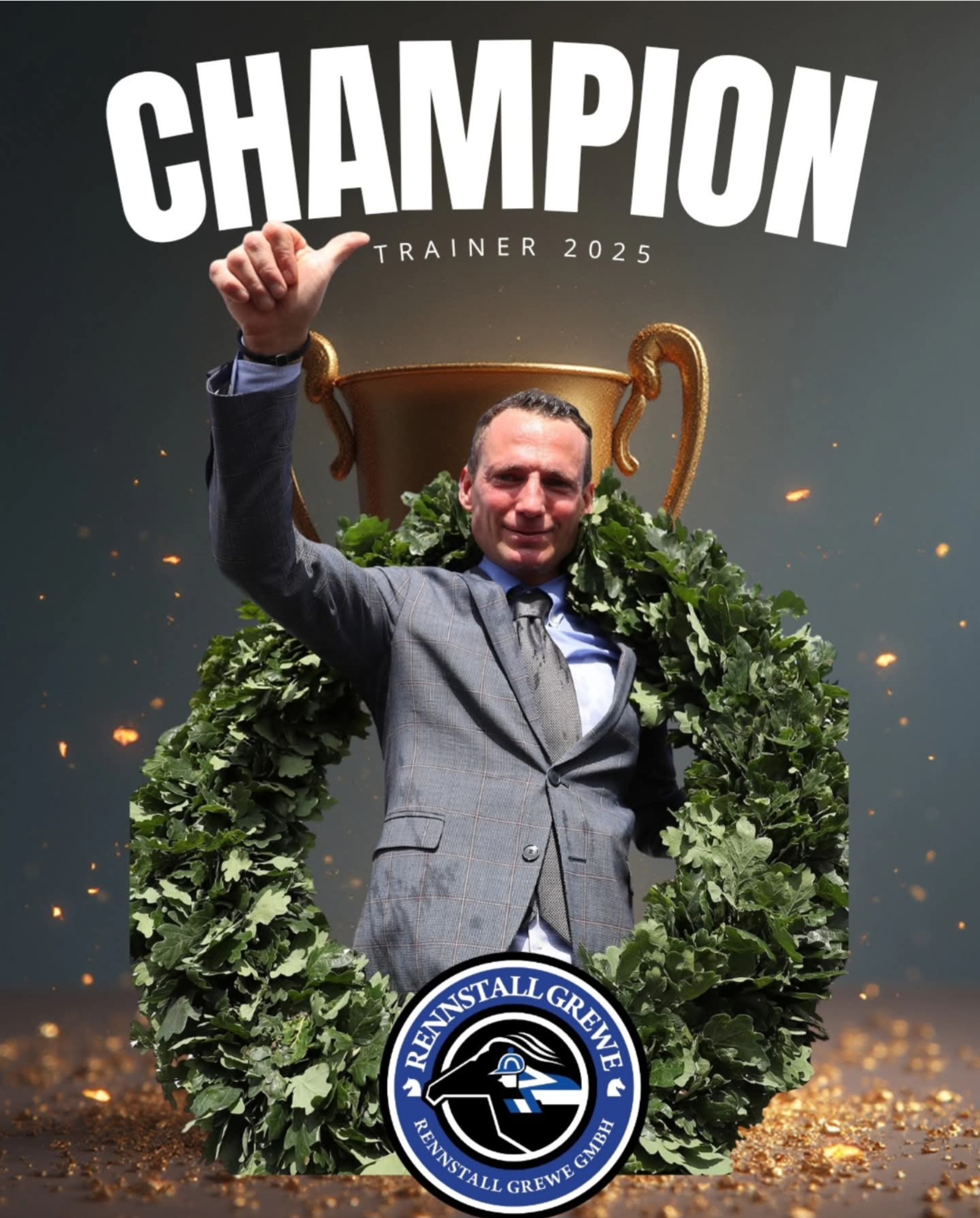 Geschafft. Henk Grewe ist der Trainer Champion 2025 und dies quasi “kampflos”. Denn da gleich in der einleitenden Prüfung der von Peter Schiergen aufgebotene Turlow seiner exponierten Rolle als 1,3:1 Totofavorit nicht gerecht und nur Zweiter werden konnte, war der Titelkampf am heutigen Sonntag in Dortmund schon früh entschieden. Wir gratulieren hiermit herzlich zum dritten Titel nach 2019 und 2020, wobei diese Grüße nach Teneriffa und damit ins aktuelle Urlaubsdomizil des Trainers gehen.