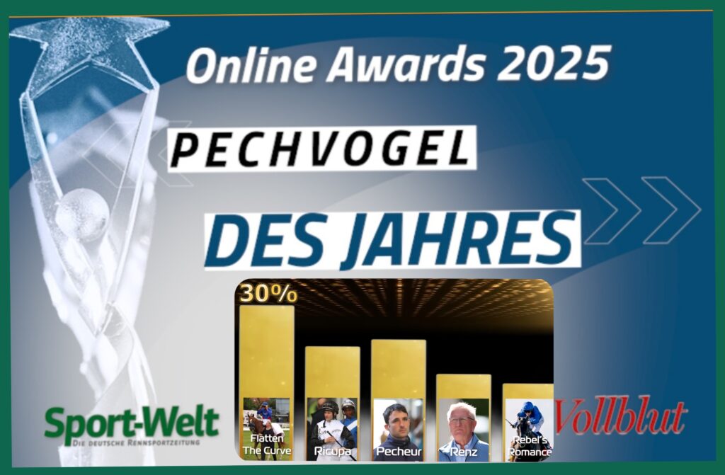 Jetzt gibt es für drei amtierende Champions doch noch einen der von GaloppOnline.de in Cooperation mit Sport-Welt und dem Magazin Vollblut veranstalteten online – awards. So wurde der von Henk Grewe für Eckhart Sauren vorbereitete Wallach Flatten the Curve mit 30 % der Stimmen verdient zum “Pechvogel des Jahres” 2025 gewählt.